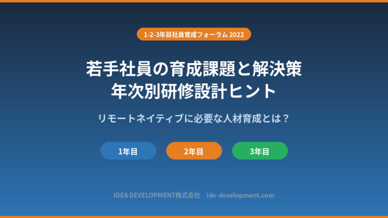 IDEA DEVELOPMENT株式会社(アイディア社)が毎年開催する、若手社員の育成に携わる人事・研修担当者向けの無料セミナーです。新入社員・2年目・3年目それぞれの育成課題と、具体的な研修プログラムの設計ヒントを、事例やデータとともに紹介します。