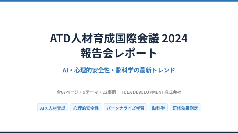 IDEA DEVELOPMENT株式会社では、多忙な人材育成担当者様に代わってこの国際会議に参加し、現地で集めた最新トレンドと成功事例を報告会として共有しました。2024年6月6日にオンラインで開催された報告会には約300名が参加。本記事では、報告会レポート(全67ページ)の内容を9つのキーワード別に凝縮してお伝えするとともに、セミナー映像を無料公開しています。