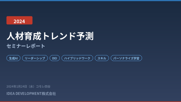 2024年1月24日、IDEA DEVELOPMENT株式会社はコモレ四谷にて「人材育成トレンド予測2024」セミナーを開催しました。毎年恒例となっているこのセミナーでは、海外の最新トレンドレポートを横断的に分析し、その年の人材育成の方向性を予測しています。