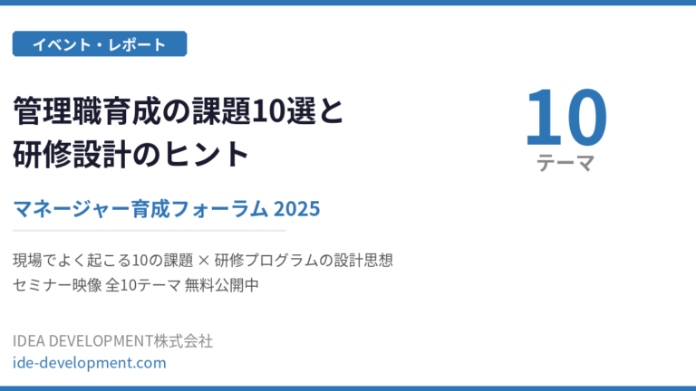 2025年10月、アイディア社はオンラインにて「マネージャー育成フォーラム 2025」を開催しました。企業の人材育成・人事担当者を対象に、現場でよく起こるマネジメント課題10テーマを取り上げ、それぞれに対応する管理職研修プログラムの設計思想と構成イメージを解説したセミナーです。