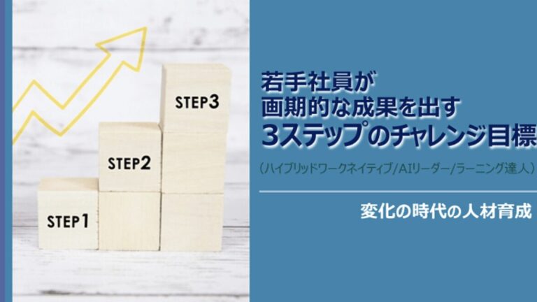 急激な変化を続けるビジネス環境を考えると、若手社員をより早く活躍できるようにすることが必須です。1年目でハイブリッドワークネイティブに、2年目にはAIリーダーに、3年目にはラーニング達人になるような高い目標を設定しませんか?この3ステップを実践することで、人材育成は社員の成長・会社の競争力・ビジネス成果に直接貢献できます。